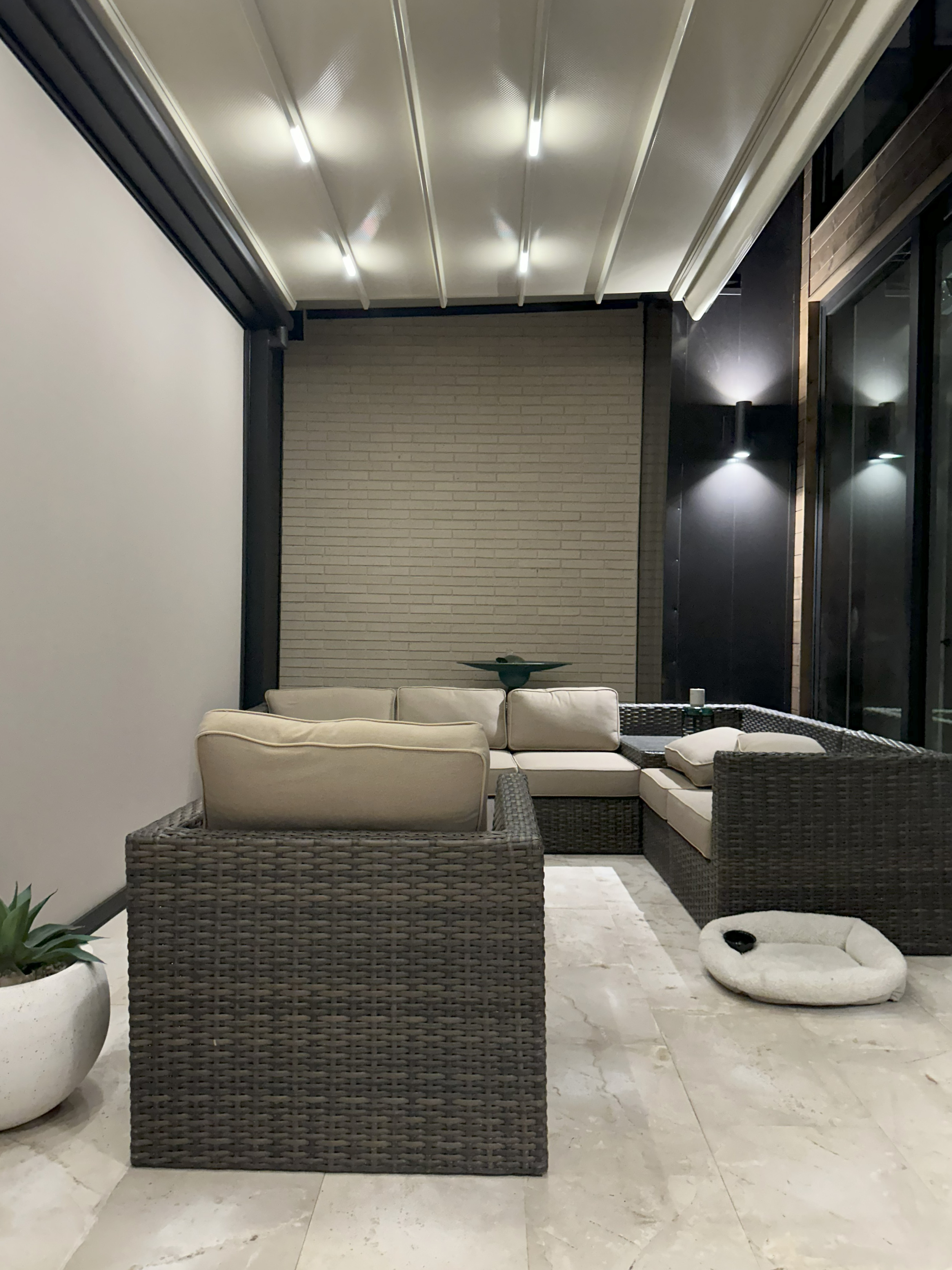 Water management is built in, not added on. Concealed channels and hidden downspouts quietly direct rainwater through the structure — keeping patios dry, clean, and architecturally seamless.